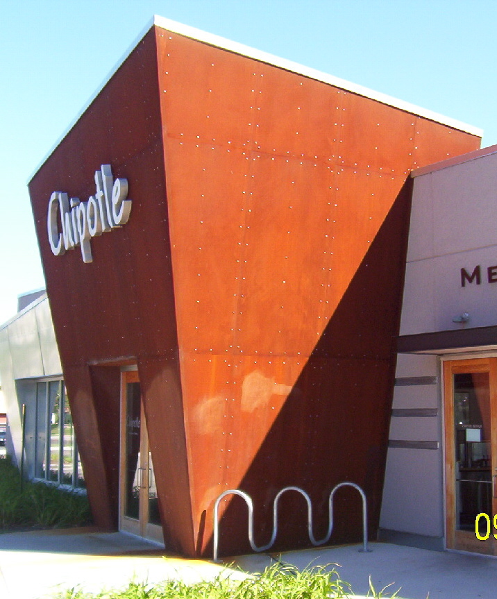 Metal Edge works closely with our Customers and Architects to help them create exactly the look they want. Some metal projects need to go through an aging process to accomplish the specific look they're trying to achieve. This Chipotle project utilized cor-ten steel acid aged to provide a weathered look.